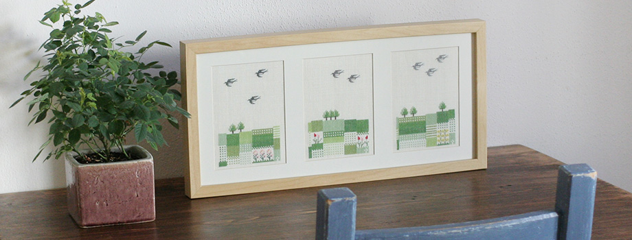 一般的に自然や生活の身近なモチーフを質の良いリネン100%の生地にマットな色調のデンマーク花糸を使ってクロスステッチで刺す作品が多いです。壁飾りとしての作品も多いのですが生活に使用するものに刺すことが多いことから表をきれいに仕上げることはもちろん、裏の始末にこだわりがあるのが特徴です。